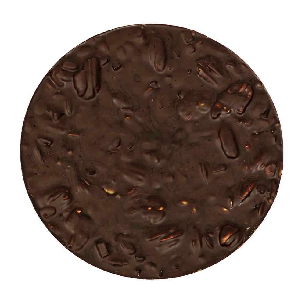Este chocolate negro redondo está elaborado con aditivos cuidadosamente seleccionados. El clásico sabor a chocolate (55%) está enriquecido con cuajada de nuez pecana (10%), trozos de frambuesa (10%) y bayas de goji (5%). Las semillas de calabaza (5%) aportan un toque crujiente y una textura aún más intensa.